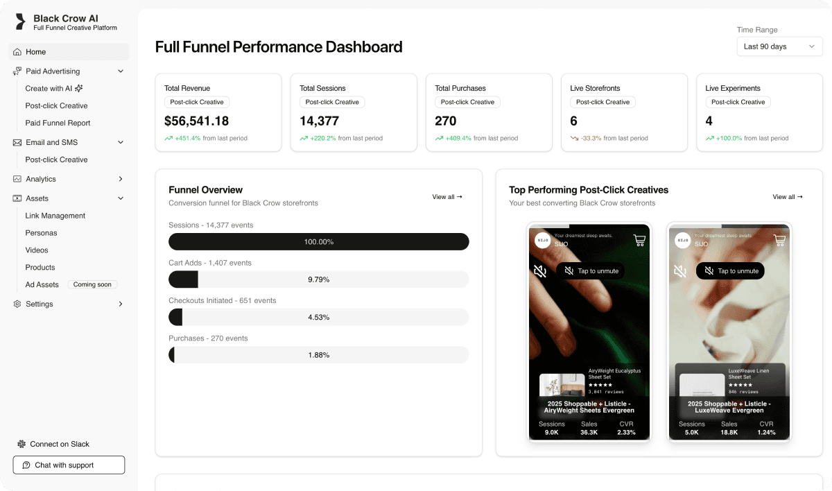 Black Crow Storefronts uses AI to auto-generate and optimize post-click destinations, turning Meta ad traffic into continuously improving, high-converting shopping experiences.